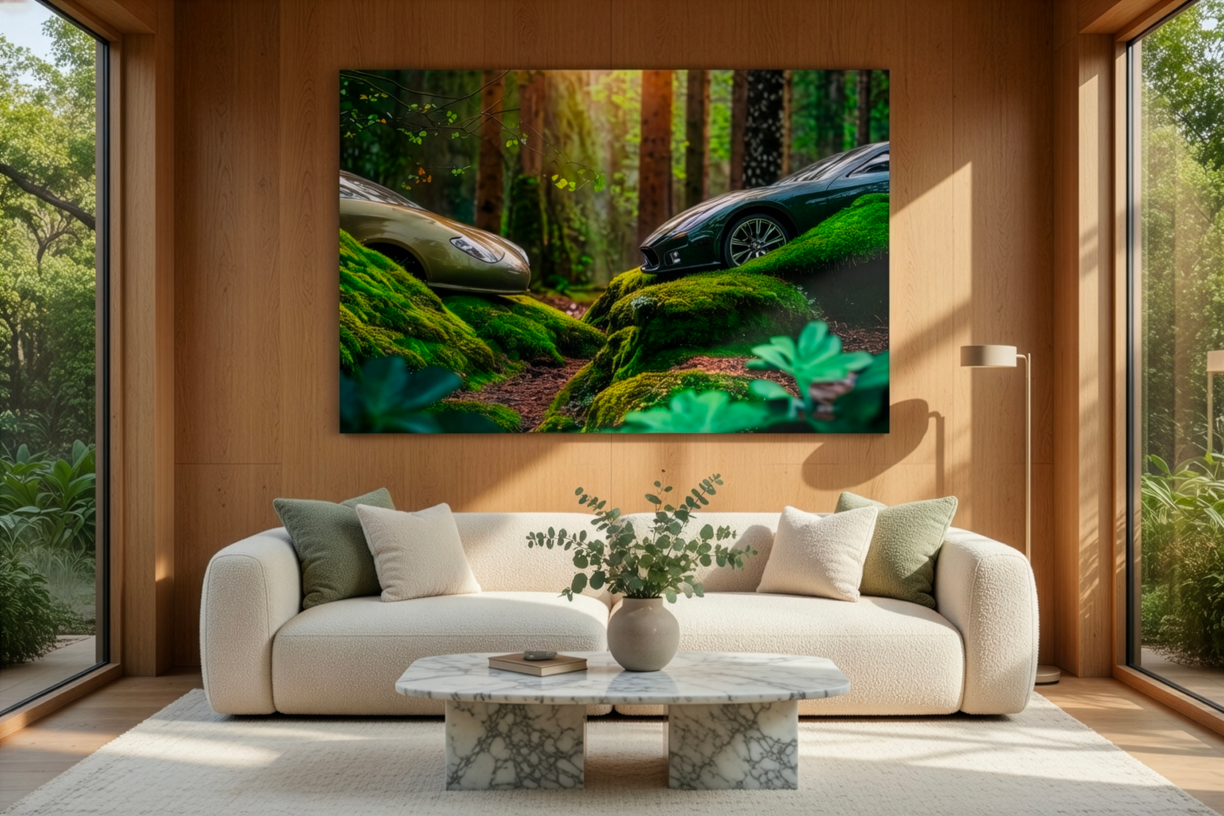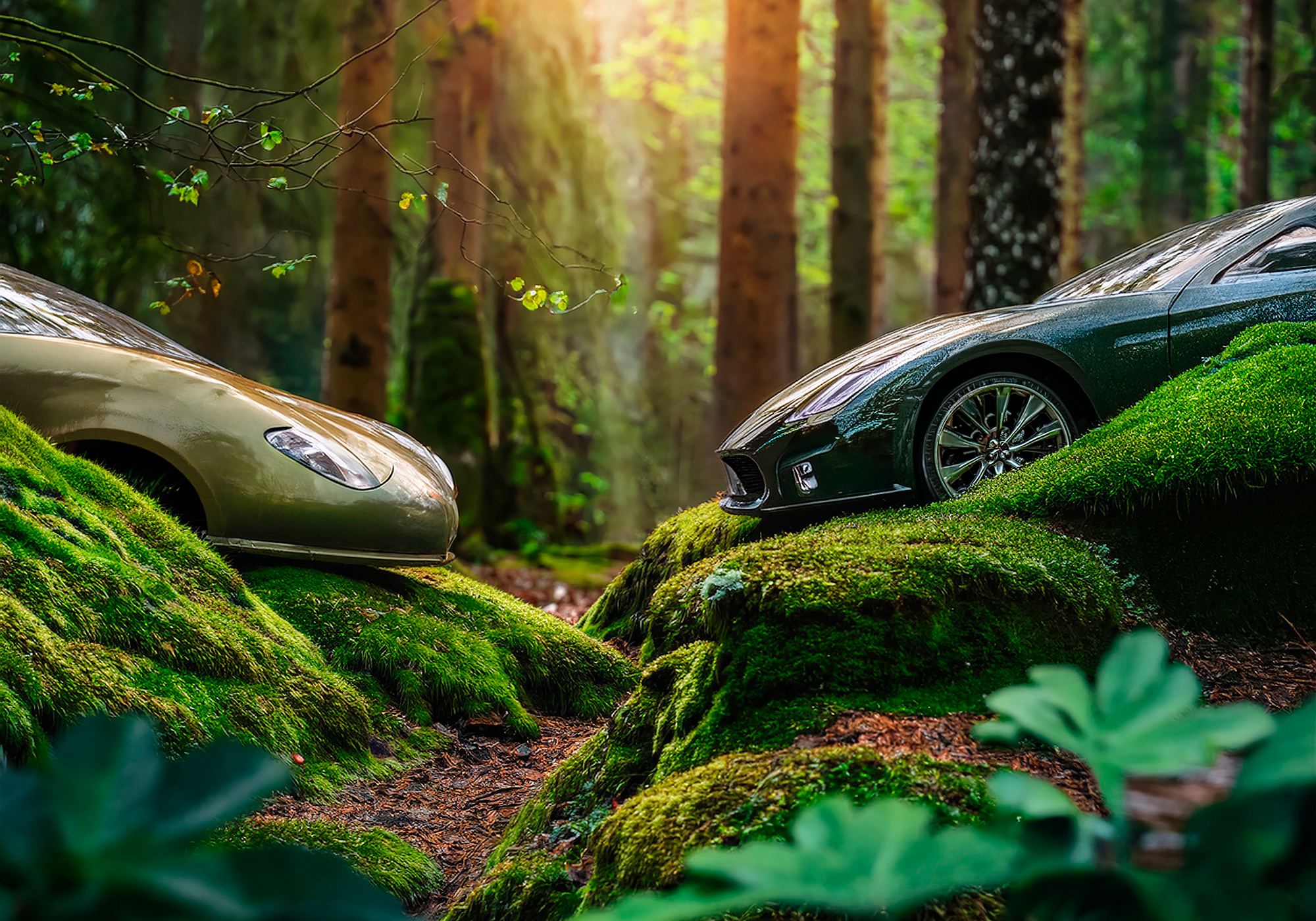 Moss Overdrive #2, 2026 – 100 × 150 cm, plexiglas 4 mm. Composition en diagonale basse, où deux bolides se font face dans une clairière encaissée, sous une lumière rasante qui traverse les pins et accentue les reflets humides sur la carrosserie. La mécanique est ici transformée en vestige d’un écosystème dominant. Parfaite pour espaces intérieurs où la pièce agit comme un fragment de nature reclaimée.