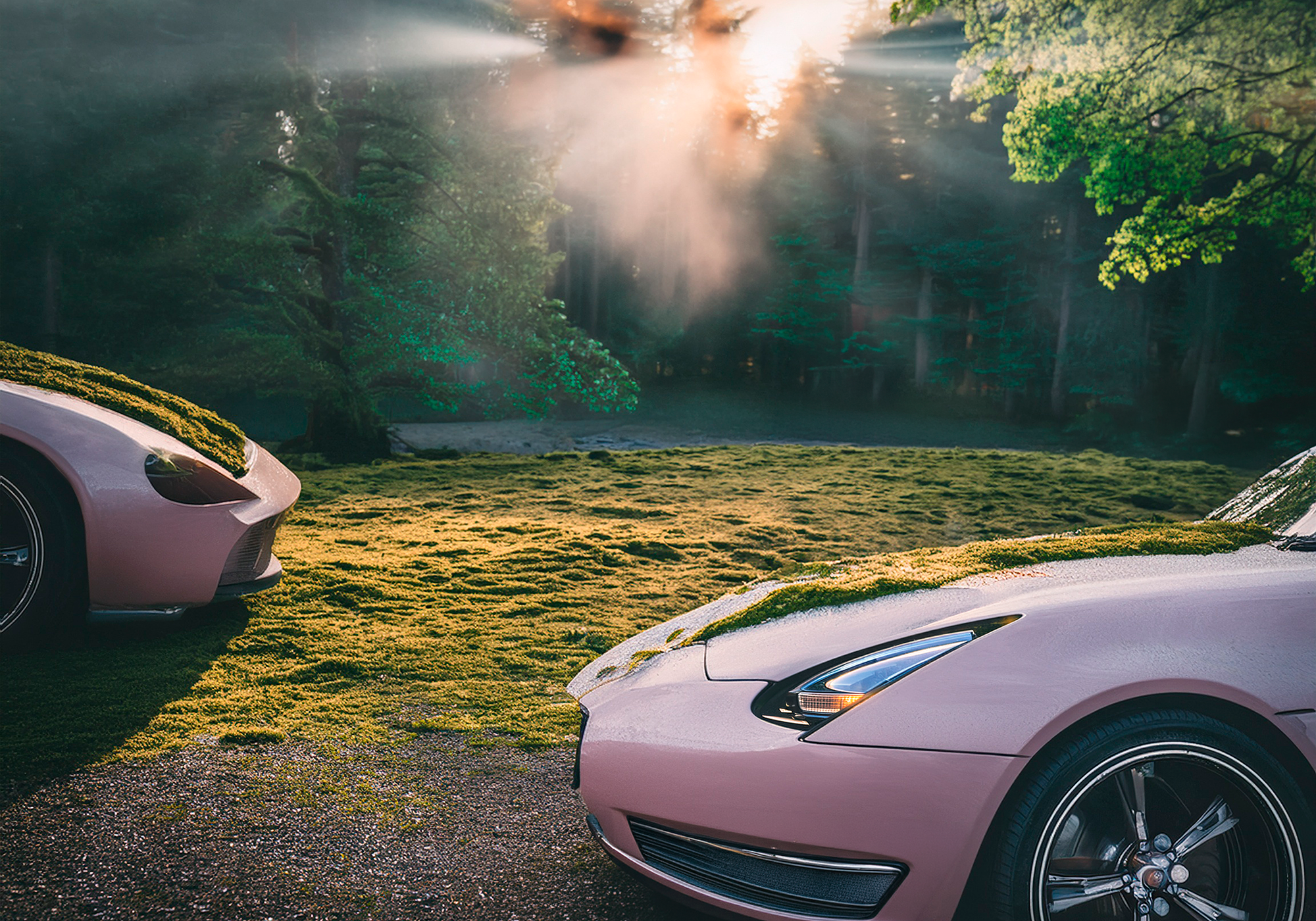 Moss Overdrive #4, 2026 – 100 × 150 cm, plexiglas 4 mm. Vue basse dans une clairière embrumée, où deux bolides roses émergent d'un tapis herbeux sous des rayons solaires diffus filtrant à travers la canopée. Eveil suspendu entre mécanique et atmosphère sylvestre. Idéal pour intérieurs cherchant une profondeur mystique et lumineuse.